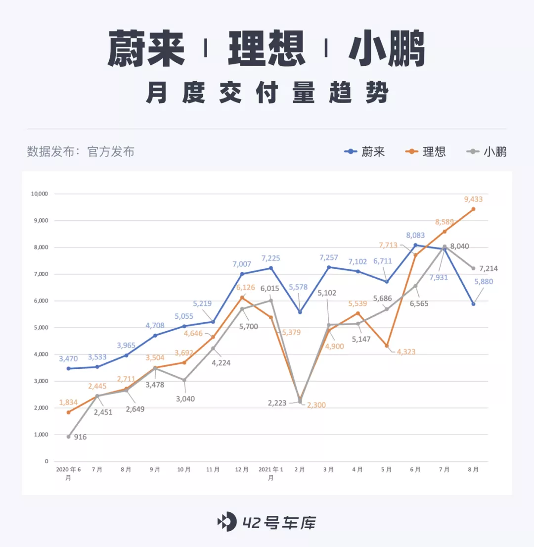 新能源三傻都公布了8月份交付数据,$理想汽车(LI)$ 以9433台再度站到榜首,$小鹏汽车(XPEV)$ 以7214辆位居第二,$蔚来(NIO)$ 则是相对5880台。