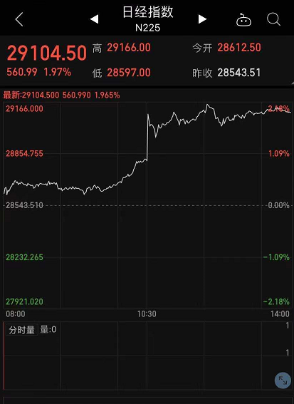 消息一出,日经指数瞬间直线拉升。截至今天收盘大涨560点,涨幅近2%。