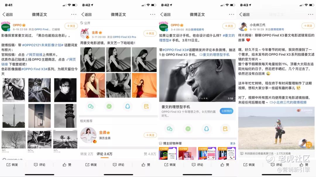 姜文出演的广告大片集中出现在了多个应用的开屏和信息流广告中,同时OPPO也在微博等平台上通过品牌官方账号发布相关内容。而金晨随后放出的海报,延展《姜文的理想型》广告片的热度。