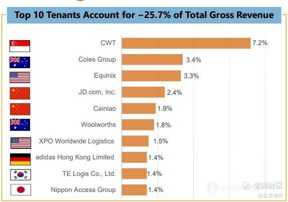 丰树物流,目前租户超过 700 名租户,10 大租户占了 25.7% 的营业额,来自各国群体,当作大腕包括京东及菜鸟物流,由此可以判断,丰树物流的租户也是相当有素质。