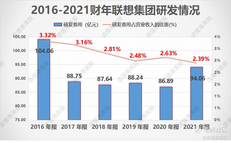 2016-2021六个财年,如果只看联想集团的研发费用的绝对金额还算是比较多的,但如果和同期营收相比,研发投入占比仅分别为3.32%、3.16%、2.81%、2.48%、2.63%、2.29%。联想的研发投入占比不仅不到3%,还在逐年降低。