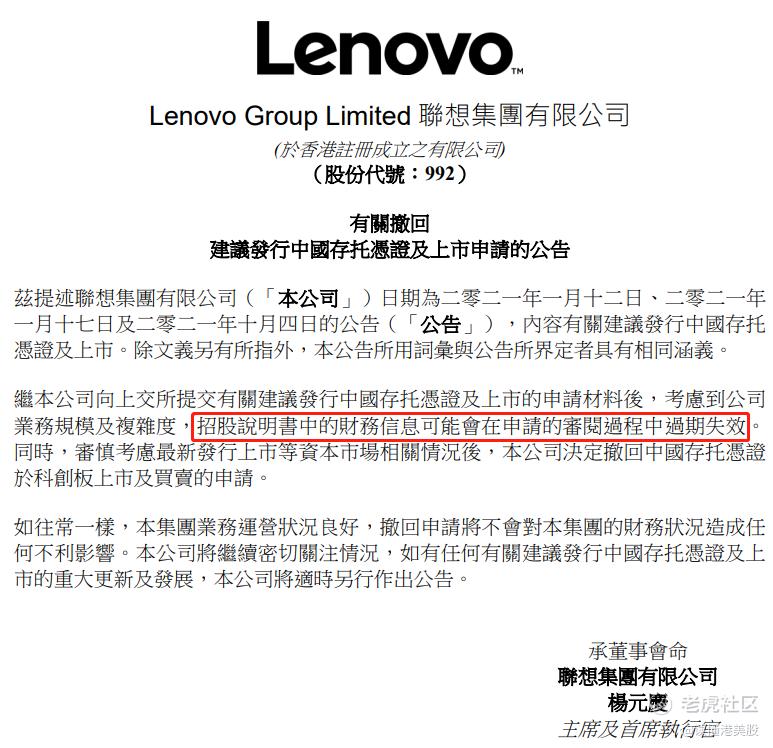10月10日,联想发布公告,解释了撤回申报的原因:考虑到公司业务规模及复杂度,招股说明书中的财务信息可能会在申请的审阅过程中过期失效。