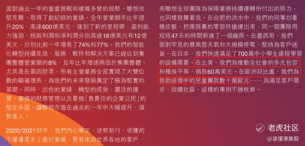 最后呢,有个小插曲,我在看联想集团2021财年年报时,发现去年它在北美、欧洲都有可观的捐款,但是,并未提及中国。我也不知道该说什么,大家自己品吧。