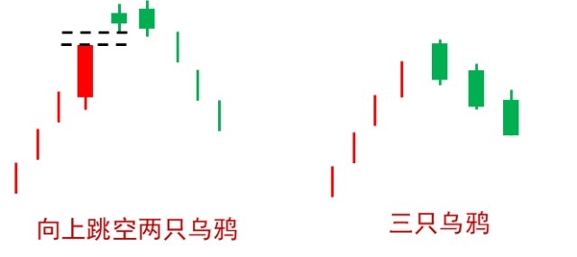 (1)三只乌鸦:上涨趋势中突然出现的连续三根依次下降的三根实体阴线,收盘价应近似最低,开盘价在前日阴线实体内部以下。