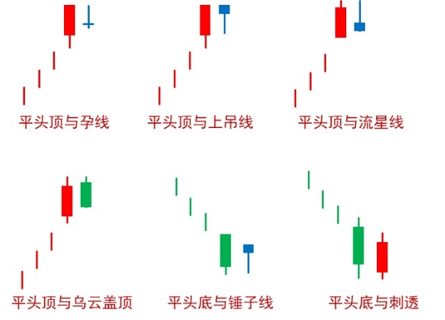 (1)平头顶:上涨趋势中的一个红色长实体其后出现一个小实体,二者具备同样的最高点,形成平头顶部形态。