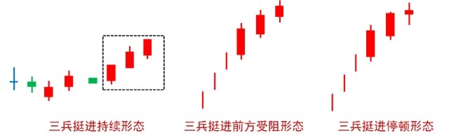 上涨中的白三兵,三个实体依次减小,有一定的影线,则称为前方受阻形态,最后一个阳线近似于星线时又称停顿形态,意味着多方能量的衰退。