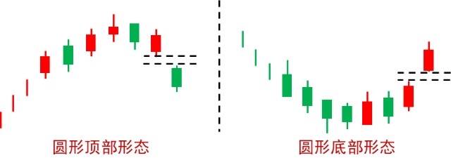 圆形顶部:上涨趋势后逐步向上凸起形成圆弧,即高点先升后降,出现不明显的缓步下降,随后出现一个向下跳空。