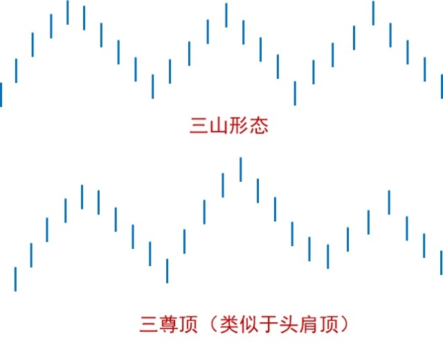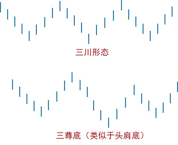 三山形态的中间山峰如果高于两侧山峰,即成为头肩顶形态;三川形态如果中间山谷低于两侧山谷,即成为头肩底形态。