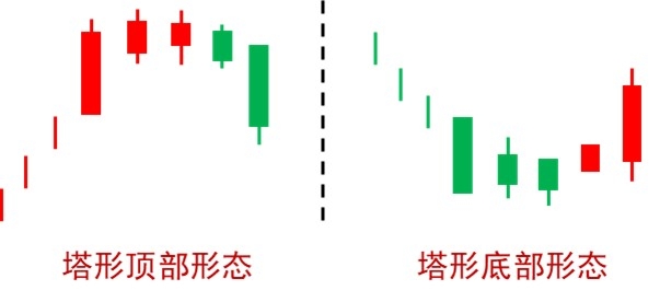 塔形顶部:上涨趋势在高价格水平上,在一个大阳线后出现若干小实体,高点基本平齐,随后出现一根或数根大阴线。