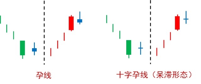 (3)子线实体越小,孕线的反转意味越强。如果子线位十字线,即为十字孕线,又称“呆滞形态”。十字孕线出现在顶部时更有效力。
