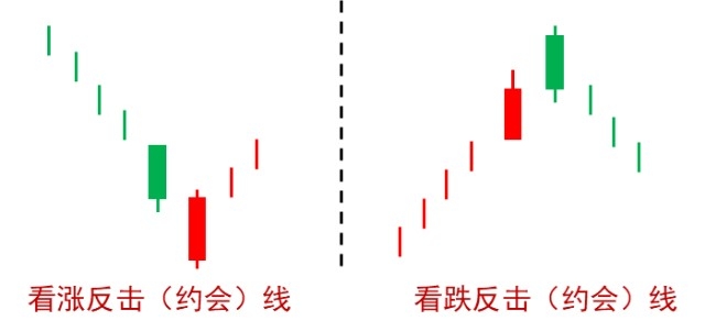 两根颜色相反的K线具有相同的收盘价即形成反击线(约会线)形态。意味着在原来的趋势上,第二天开市也大幅高/低开(甚至是新高/低),但到收盘时,被对手盘绝地反击收复失地。