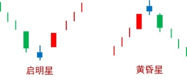(4)黄昏星是与启明星相对应的顶部反转形态。关键之处在于第三个绿色实体向下穿入第一个红色实体内部的深浅程度。