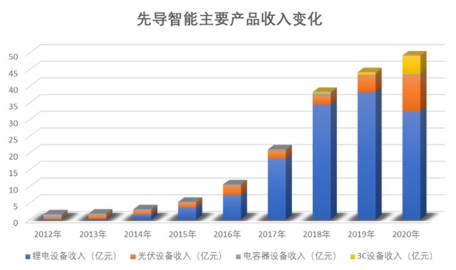 2020年,在锂电设备受下游开支萎缩影响,收入下降15.05%的情况下,先导智能营收和归母净利润仍同比增长25.07%和0.25%。原因就在于光伏设备和3C设备业务,二者全年收入分别大增119.07%和652.82%。