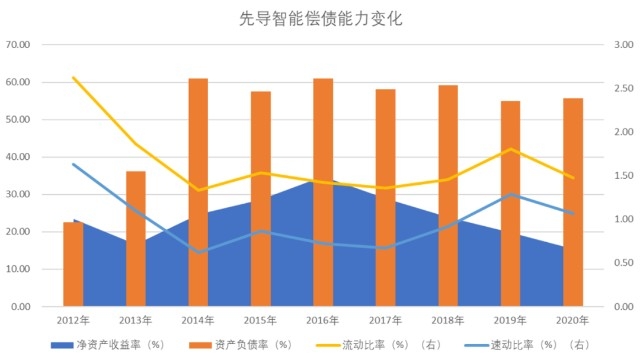 2014年开始,先导智能大举扩张,当年资产负债率同比增加近25个百分点,并带动净资产收益率大幅提升。不过,虽然其负债率在此后多年仍保持在60%上下,但自2017年开始,净资产收益率连续下滑,最近两年又伴随着负债率的下降而进一步走低,到2020年仅为15.51%。说明财务杠杆对其净资产收益率的支撑已经有限。