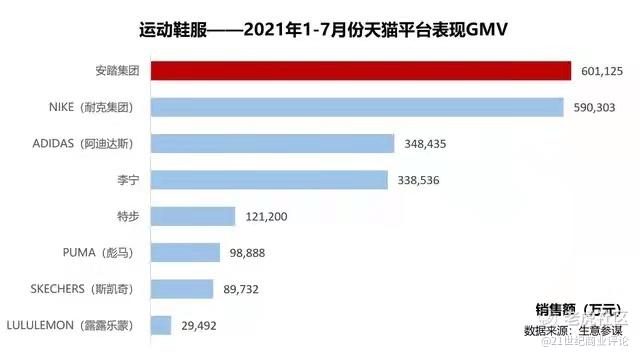 据天猫平台数据显示,1-7月,安踏集团线上总流水排名位居所有体育用品企业第一位。天猫平台数据显示,1-7月份,安踏集团旗下品牌总成交额达成以企业维度计算,在“运动户外”类目排名第一,这也是首次由中国企业占据行业榜首。