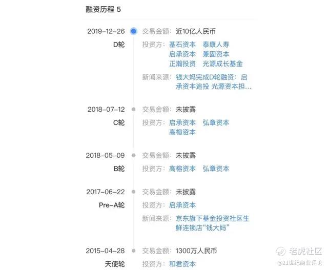 2014年底,钱大妈开放加盟,获得高榕资本、启承资本等知名机构持续下注,截至2019年间,共获得5轮融资。