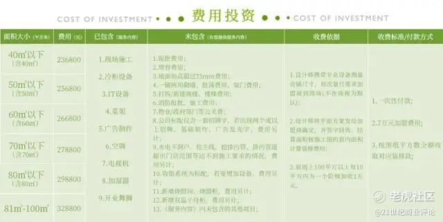7万加盟费、4万保证金、2万货物预付款,装修费用23.68万—32.88万(40平米-100平米),租金每月一万元,押一付六,月人工开支两三万(约5名员工)。