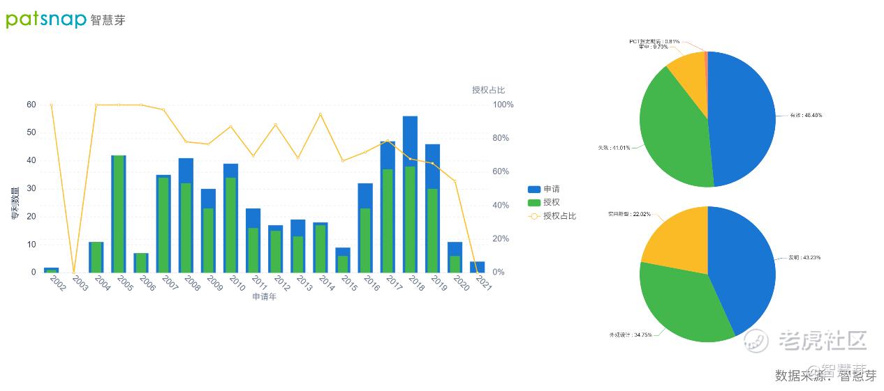 图:同仁堂专利趋势(左)、专利状态(右上)、专利类型(右下)