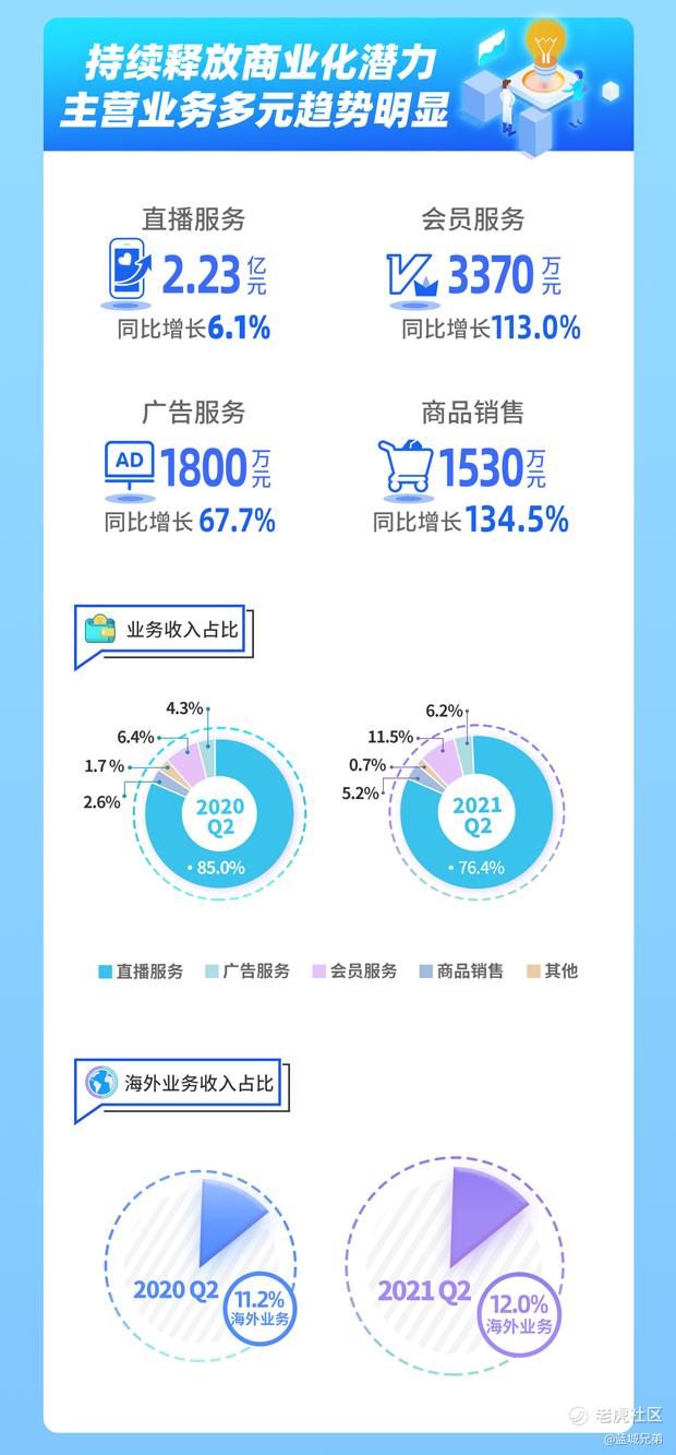 第二季度,蓝城兄弟直播服务收入达到2.23亿元人民币,继续保持健康增长。同时,会员服务、广告服务和商品销售等服务再次成为蓝城兄弟业绩增长亮点,直播外收入在整体业务收入中的占比首次突破了20%。其中,会员服务收入3370万元人民币,同比增长113.0%;广告服务收入1800万元人民币,同比增长67.7%;来自荷尔健康的商品销售收入1530万元人民币,同比增长134.5%。