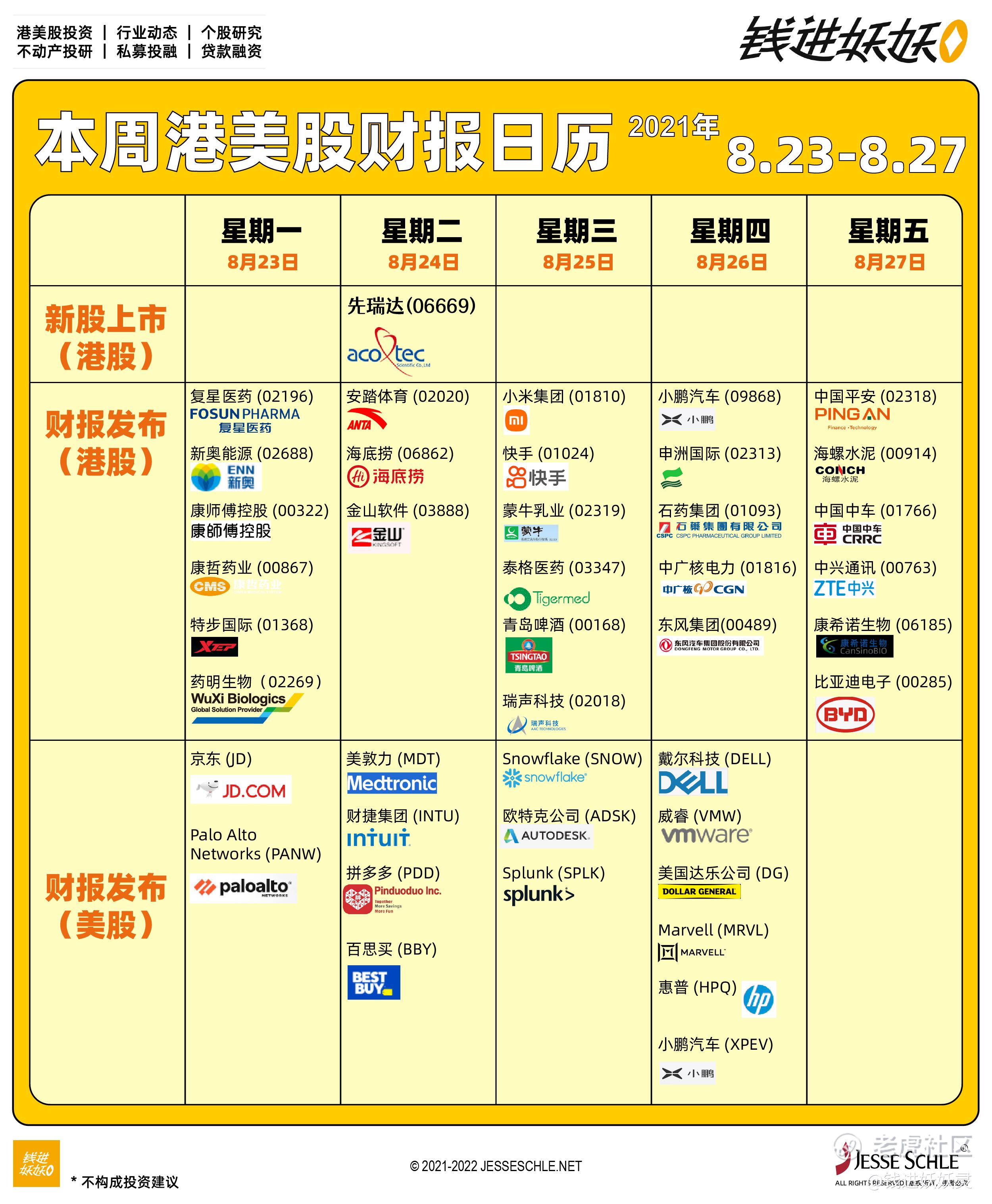 【小妖灵本周港美股财报日历】2021年8月23-27日,港股主要股票开始陆续发布二季度财报,请注意波动。#快手# #小米# $药明生物 hk02269$