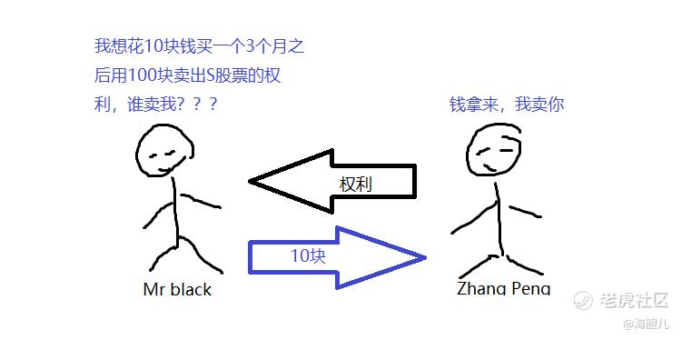 Mr.black觉得S股票现在100块,未来三个月会上涨,所以他想要花10块钱买一个权利,这个权利就是三个月之后他还能用100块买入S股票的权利。
