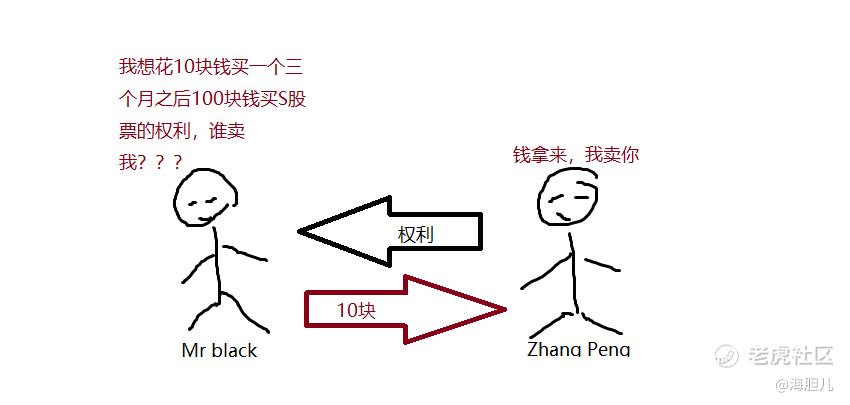 Mr.black觉得S股票现在100块,未来三个月会下跌,所以他想要买一个权利,这个权利可以让他三个月之后用100块的价格卖出S股票。Zhang Peng觉得可以呀,那你付10块钱,我卖你这个权利。因为Mr.black是掏钱的人,所以三个月之后他可以决定行不行使这个权利。