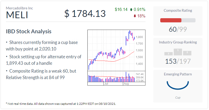 根据MarketSmith的分析,自那以后,MELI股票以2020.10点的入市点形成了一个杯形基础。买入区间延伸至2121.11。在该买入区间以上买入MELI股票风险更大。