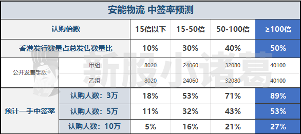 安能物流(9956.HK)正在招股,一手入场费8525.05港币,价格13.88-16.88港币,一手500股,对应按照目前的热度,预计参与人数为3-10万左右,预计一手中签率30%,预计30手可中一手,预计乙头可中60-70手左右。乙头600手,512万港币,20倍孖展需本金约25.6万港币。
