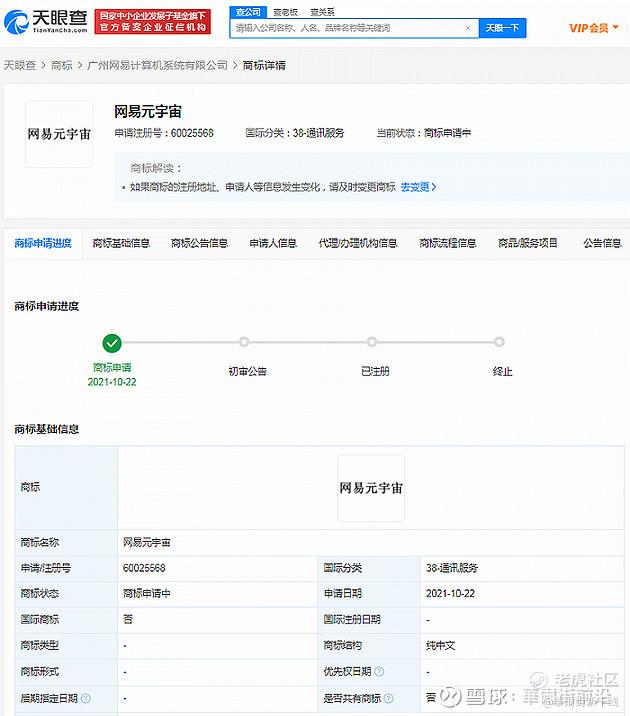 近日,网易(杭州)网络有限公司、广州网易计算机系统有限公司等多个网易关联公司申请注册“网易元宇宙”“雷火元宇宙”“伏羲元宇宙”等商标,国际分类涉及广告销售、教育娱乐、网站服务等,当前商标状态均为申请中。天眼查数据还显示,目前已有400多家企业申请了元宇宙相关商标。