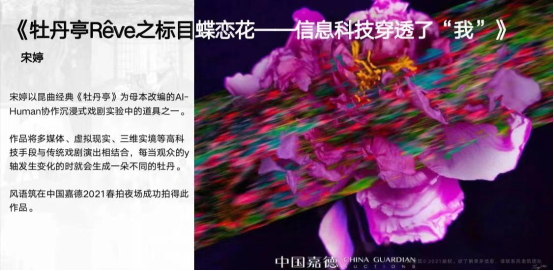 中国第一个参与拍卖的NFT作品——宋婷老师的《牡丹亭Reve之际目标蝶恋花——信息科技穿透了“我”》作品,就是我们公司拍卖下来的。所以说在新的这种词汇出现的时候,我们的眼光和触觉,包括我们的行动力都是非常的迅速的。