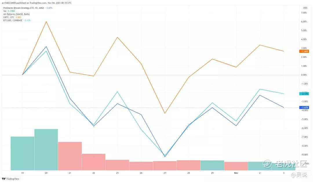 第二日,BITO 交易金额继续创下新高,达到12.94亿,两日涨幅共5.87%。截止11月3日收盘, BITO 价格为40.4美元,自19日开盘以来下跌了3.67%。同时期,比特币现货跌幅为2.13%,略小于 BITO 跌幅。不过,由于 BITO 跟踪的是近月比特币期货,而随着近月到期日临近,期货价格会逐渐收敛至现价,因此这段时间收益率略低于比特币现货是可以理解的。比较 BITO 和 GBTC 的溢价走势会发现,至少在价格跟踪方面 BITO 的效果更明显。