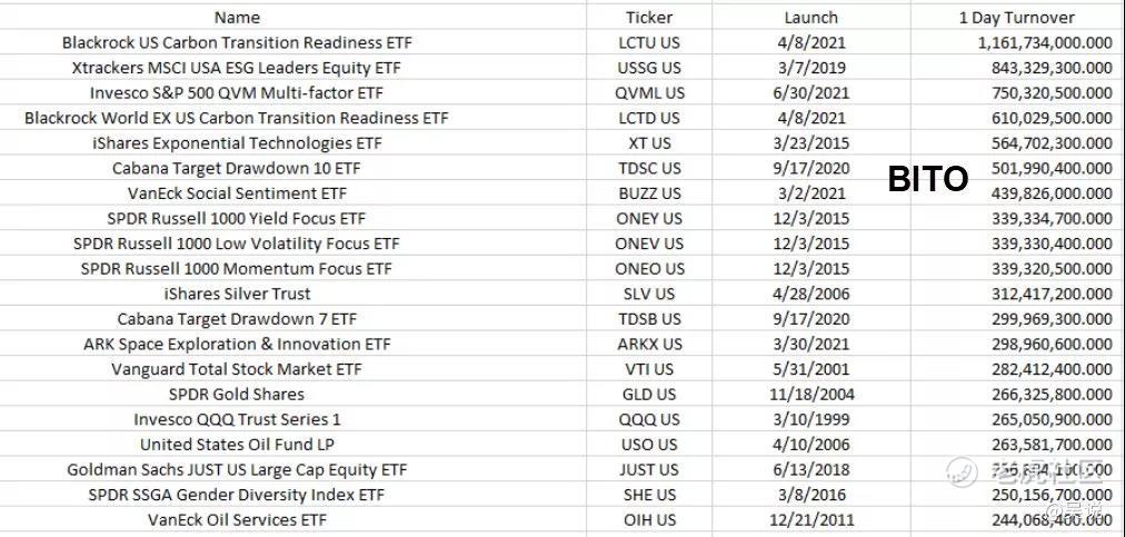 ProShares 比特币策略 ETF(股票代码:BITO)于10月19日正式上市交易,首日交易金额即超过了10 亿美元,这是有史以来发行日交易金额第二高的 ETF。继 BITO 之后的 Valkyrie 比特币策略 ETF (股票代码:BTF) 首日交易金额就低很多,仅有约7800万美元,后续比特币 ETF 将逐渐失去先发优势。