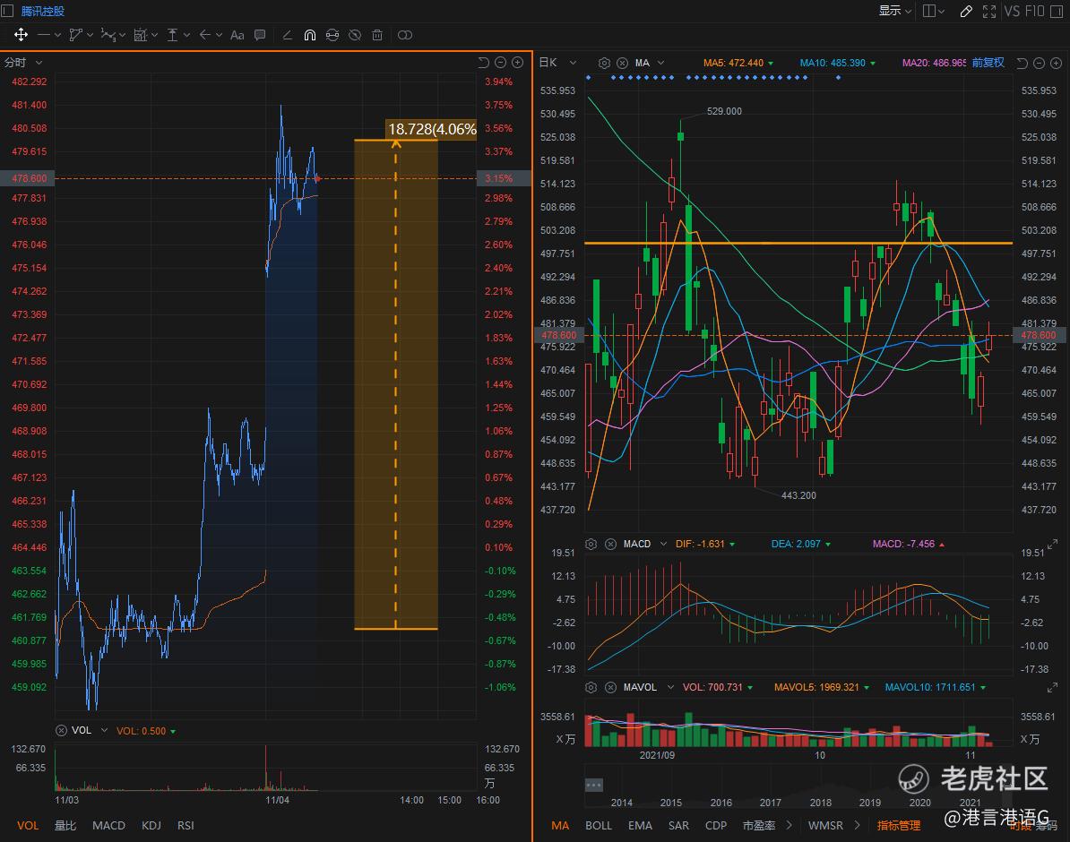 对于腾讯昨天的观点就是守住460的话就是止跌的信号,就有机会,昨天的走势,460的支撑力度强,短线的话今天的上冲力度不是很强了,480基本可以走,盈利4%左右,长线继续向上看到500。$腾讯控股(00700)$