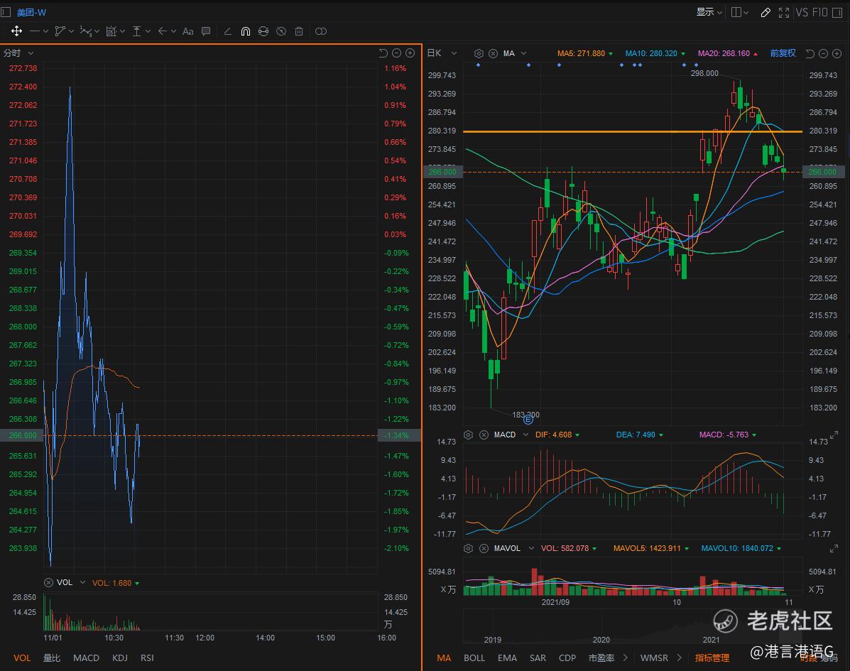美团是今天最看不懂的股票,开盘一小时走出来一个“埃菲尔铁塔”,什么玩楞,玩得太埋汰了,上周让大家关注270,今天也跌破了,继续观察找机会。$美团-W(03690)$
