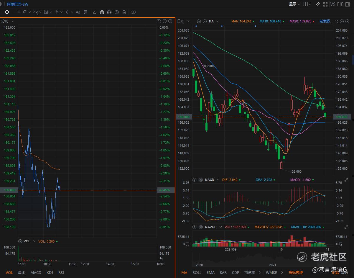 阿里巴巴上一周都在提醒大家160,今天直接跌破,可以说今天科技股整体都是破位的走势,破位之后继续下跌的概率就会增加,所以就要等给出信号才能出手。$阿里巴巴-SW(09988)$