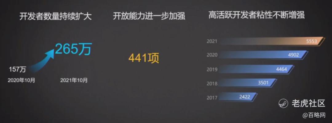 可以看到,2020年末到2021年10月,不到一年,开发者团队增加了90万,达到265万。如今,开放平台可提供能力和解决方案441项,链接生态合作伙伴365万+,应用终端设备数33亿。