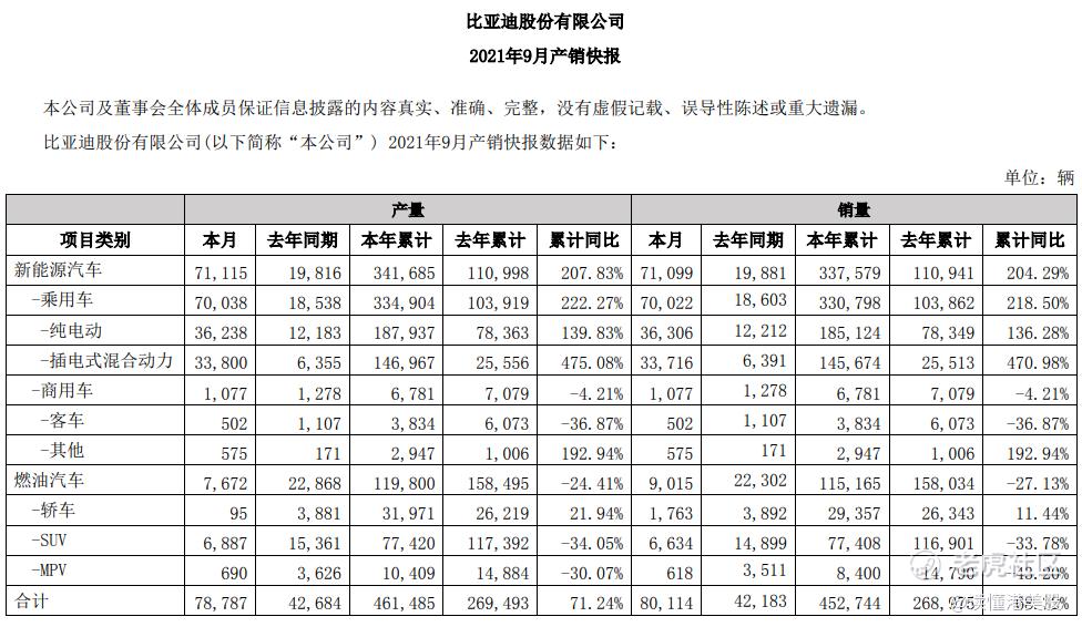 根据最新数据,9月份,比亚迪乘用车的销量为79,037辆,同比增长93.2%,环比增长16.9%;其中新能源乘用车销售70,022辆,同比增长276.4%,占总销量的88.6%,快速增长的新能源车已经成为了比亚迪市场表现的绝对主力。