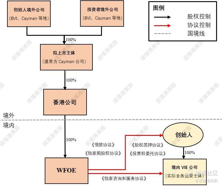 假设创始人和投资人共同出资一家企业a,处于避税和躲避监管的考虑,将公司设立在了开曼群岛。然后后期出于控制考虑,a又开香港开设了b,又通过b控制一家在国内的企业c,也就是WFOE(外商独资企业)。c又和国内的实际业务运营主体签订了协议控制,协议内容是什么呢?——c向境内VIE公司提供咨询,境内VIE公司的全部利润和收入都给c。