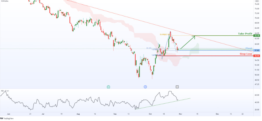 Hey all, any idea for $PING AN(02318)$? I am currently seeing a short-term bullish bounce from the pivot level in line with 38.2% Fibonacci retracement and 127.2% Fibonacci projection towards the take profit level 61.8% Fibonacci projection. My short-term bullish bias is further supported by the price holding above the Ichimoku cloud and RSI indicator abiding to the ascending trendline. [Grin] [Surprised]