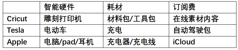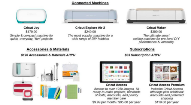 Cricut是一家销售雕刻打印机及耗材的公司,同时提供在线素材订阅服务(Printer as a service),DIY手作领域的HP+Adobe。商业模式类似Tesla/Apple,销售智能硬件及打包耗材,同时对在线premium内容收取service subscription fee。