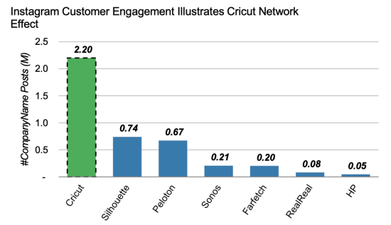 第三, Cricut的社交媒体客户参与度定义为Instagram发布的标签为#CompanyName(即#Cricut、#Silhouette、#Peloton等)的帖子是其切割机同行Silhouette的3倍,Sonos的10倍以上