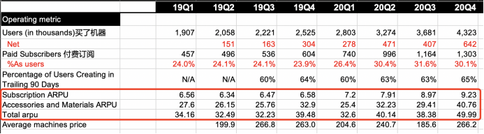 1.Cricut是2C雕刻机领域的龙头公司。依靠口碑营销&社交病毒传播,使Cricut能够比其他玩家更有效地获取客户(促新品销售,销售费用很低~6.5%;促耗材销售,从Accessories and Materials ARPU看,客群有成瘾性)和维护客户(促活跃,季度用户活跃比例稳定在63-65%,年度用户活跃度为84%)。