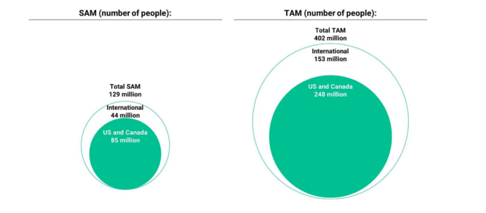 部分基于YouGov的研究,的SAM包括了美国和加拿大超过8500万人。截至2020年底拥有430万用户,其中绝大多数来自美国和加拿大,这意味着我们的SAM在这些市场的渗透率约为5%。我们估计,在我们的主要国际目标市场中超过4400万人。因此,我们估计我们的SAM总数超过1.29亿人。