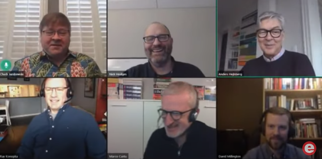 (去年Delphi 25周年庆的时候,Delphi的几位原创和现在Delphi的负责人有过一次网络欢聚。Chuck(左一)和Anders(右一)等几位超过50岁还在写代码的老人一起开心地回忆了激情燃烧的岁月。)