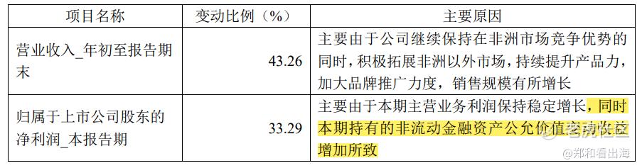 环比来看,公司收入环比增长11.36%,利润环比增长23.54%,也表现不错。我们都知道传音的营收是存在一定的季节性特征的,下半年的营收是要明显好于上半年,传音今年上半年表现不错,所以今年的环比基数也是比较高的,三季度在上半年基数比较高的情况下,还能录得11.36%的增长,还是不错的。特别是在利润端,归母净利润环比增长远超收入增长。