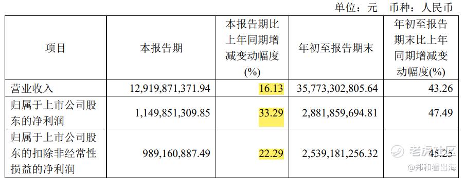 根据公告数据,公司前三季度营业收入357.73亿 ,同比增长43.26%,扣非净利润11.5亿,同比增加47.49%。收入端表现一般,利润端表现十分亮眼。