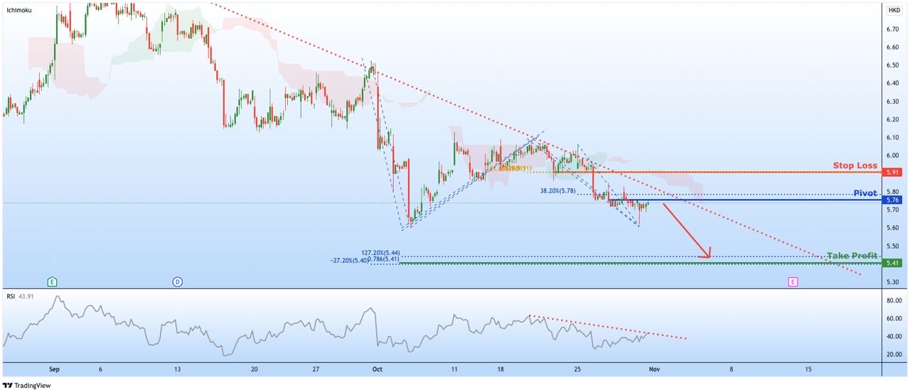 Hey all ~ I am looking at $SINO BIOPHARM(01177)$today ! I see that price could possibly be abiding to the descending trendline resistance. I am expecting a further drop from the pivot level in line with 38.2% Fibonacci retracement towards the take profit level in line with 127.2% Fibonacci extension, 78.6% Fibonacci projection and -27.2% Fibonacci expansion. My bearish bias is further supported by the RSI indicator where it abides to the descending trendline resistance. [Onlooker] [Chuckle]