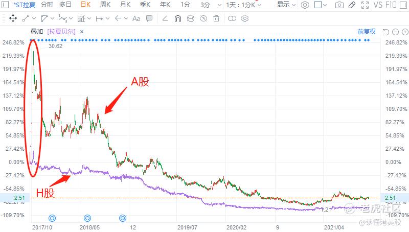 其实,有时候港股就是A股的一个“照妖镜”,比如曾经辉煌如今落魄的拉夏贝尔,A股的拉夏贝尔现在被st了,而早在2017-2018年它的港股价格9块多,A股价格为30,体现了溢价的天差地别,也说明了A股严重泡沫。