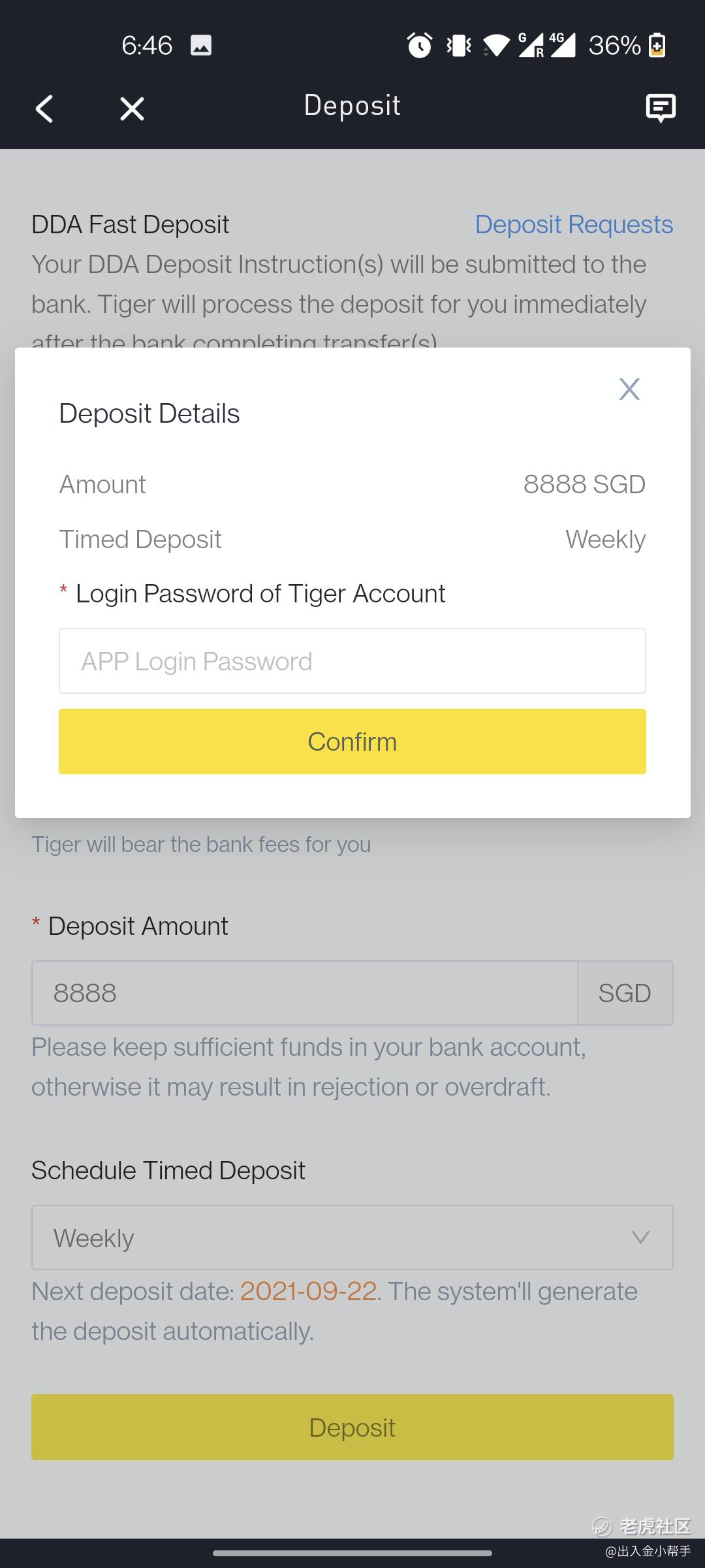 2.如果需要设置定时入金,在“Schedule Timed Deposit”下方下拉框做选择,选择定时入金的时间周期;