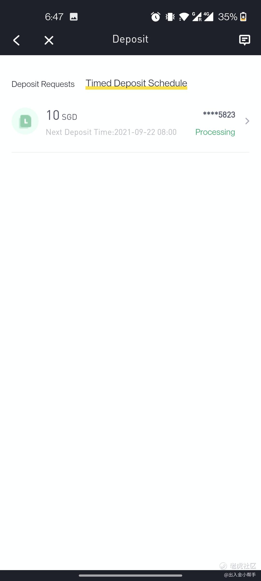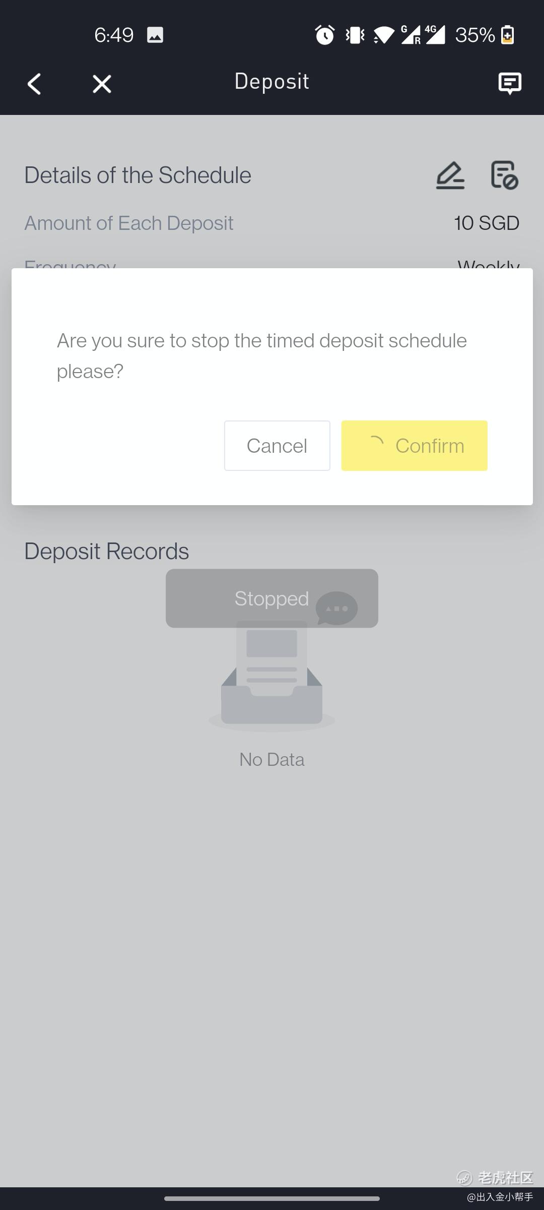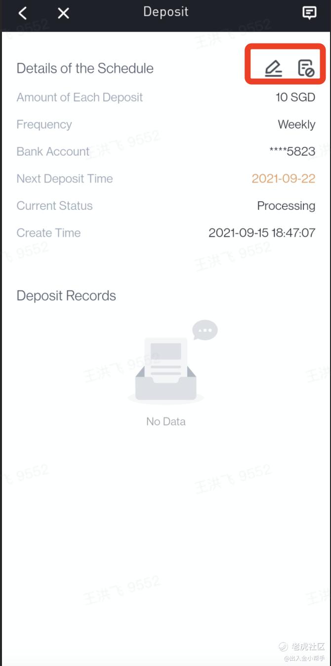 1.入金记录页面,点击“Timed Deposit Schedule ”;进入定时入金历史设置页面,右上角两个图标,左侧为修改,右侧为暂停;如果想要修改定时入金可点击后编辑修改;如果暂定直接点击暂停图标。